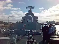 Bristol was refitted at A&P Tyne, Hebburn. The effects of the refit were said to "... extend the service life of HMS Bristol for 10 years". Work was intended to bring facilities on Bristol in line with health and safety standards.[7] The redundant masts containing the ship's Type 1022 and Type 992Q search radars were removed.[8] She departed from Portsmouth on 20 October 2010,[9] and arrived at Hebburn under tow on the morning of 3 November 2010. HMS Bristol left Hebburn in April 2011[10] to return to Portsmouth.[11]