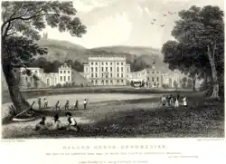 According to Nikolaus Pevsner, the house was built in about 1735 by Sir George Chudleigh, 4th Baronet (died 1738), and was supposedly influenced by Buckingham House in London, built in about 1715.[1] Chudleigh's ancestral seat was at nearby Ashton House, on the west side of Haldon Hill, the residence of his family since about 1320, and which he abandoned to build Haldon House on the east side of the hill. In 1798 Ashton House was in ruins.[5] Sir George married Frances Davie (1697-1748),[6] one of the four daughters and co-heiresses of Sir William Davie, 4th Baronet (1662-1706/7) of Creedy, Sandford, Devon.[7] Chudleigh died leaving four daughters who were co-heiresses.