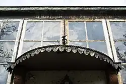 The exterior of the house's main entrance is topped by a large statue of a flower bouquet.[3] At the front of the house, ornamental lead rain gutter downspouts empty into ornamental semicircular metal cisterns.[3] The home's main entrance hall is an elegant ovular wood-paneled space featuring a curving staircase, a fireplace. The entry hall has a view of Lake Michigan, visible through the tall windows of the home's east-facing bay-windowed sun porch, which is placed on a direct east–west axis from the entry.[3]
