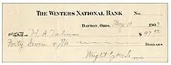 Partly Printed Check filled out to H.A. Toulmin and signed by "Wright Cycle Co./W.W." in Dayton, Ohio, May 11, 1907.