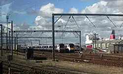 Harwich International railway station is a railway station on the Mayflower Line, a branch of the Great Eastern Main Line, the station serves Harwich International Port in Essex, England. It is 68 miles 72 chains (110.88 km) from London Liverpool Street, between Wrabness to the west and Dovercourt to the east. Its three-letter station code, HPQ, derives from its original name, Harwich Parkeston Quay.[1]