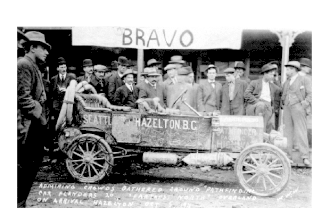 The Pacific Highway Association offered a gold medal to the first car to travel from Seattle to Hazelton, which was the tentative terminus of an ambitious highway scheme. In October 1911, P.E. Sands and his mechanic completed the journey in a Flanders 20. Lacking a road north of Quesnel, they followed the old telegraph trail. For about 64 kilometres (40 mi) of this section, it was necessary to dismantle the vehicle for hauling with horses. This was the only gap not covered under motor power. The motorists were honored by a banquet[63][64] before returning south by steamboat, train, and steamship.[65] The awarded medal has been retained in Hazelton since 2013.[66] The automobile is on display at the Kittitas County Historical Museum in Ellensburg, Washington.[67]