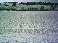 A Headland, in agriculture, is the area at each end of a planted field.[1] In some areas of the United States, this area is known as the Turnrow. It is used for turning around with farm implements during field operations and is the first area to be harvested to minimize crop damage. The rows run perpendicular to the lay of the field and are usually two, three or four times the width of the implement used for planting the field.