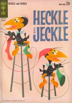 Heckle and Jeckle are postwar animated cartoon characters created by Paul Terry, originally produced at his own Terrytoons animation studio and released through 20th Century Fox. The characters are a pair of identical anthropomorphic yellow-billed magpies who usually cause problems to others and for themselves with their bizarre antics. Heckle speaks in a tough New York style manner, while Jeckle has a more polite British accent. They were voiced at different times by Dayton Allen (1946–66), Sid Raymond (1947), Roy Halee (1950–1955, 1959–1961), and Frank Welker (1979).[3][4]