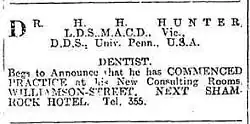 5. ^ Dental Board of Victoria: First Year L.D.S. Course, The Argus, (Thursday, 5 December 1901), p.9; (note that, although the names of others in his cohort appear in the results of the November 1902 examinations for the L.D.S.'s second year, Hunter's name is absent [1]); Dental Board: Results of Annual Examinations: Third Year L.D.S. Course, The Argus, (Tuesday, 1 December 1903), p.7; Dental Board of Victoria: Fourth Year L.D.S., The Argus, (Wednesday, 7 December 1904), p.8.