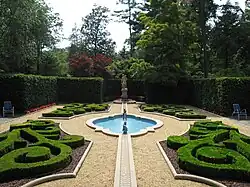 Following the tradition of parterre gardens, the Hillwood parterre is a formal garden with low detailed plantings that are divided with footpaths and walls of English ivy. Again designed by Innocenti and Webel, the garden was split into four areas using channels of moving water, gravel footpaths and a central pool that is lined with Italian glass tile. A terra-cotta sculpture of Diana overlooks the garden. She is accompanied by marble sphinxes, a cherub riding sea animals in the central pool, as well as outdoor furniture from Post's collection. This garden serves as a Post's tribute to 18th-century French aristocracy.[2]
