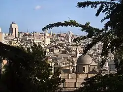 Prior to the construction of the city walls in the 12th century (known as the Barbarossa walls, with a perimeter four times as large as the previous ones),[73] three zones were distinguished in the city: the castrum, i.e., the area of the initial settlement around Sarzano; the ripa area, where traffic and activities related to the port took place; and finally the burgus, outside the walls, where the first cathedral was located, the church of San Siro, which still exists today, although it has been partially destroyed and rebuilt several times.[74] The construction of the walls, in addition to incorporating the peripheral area of the church of San Siro into the city, also included the area (closer to the previous circle of walls) of the Basilica of Santa Maria delle Vigne, which had risen about three centuries earlier in an area called Vigne del Re,[75] a name that would attest to the probable presence of vineyards immediately outside the previous city center. The cultivation of vineyards and the presence of some chestnut groves, would also be confirmed by a document from 886, which describes the area as owned by the monks of St. Peter's Church, the clergymen of St. Syrus Cathedral and the family of the viscount (vicecomes) Ydo.[76]