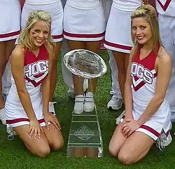 Arkansas won the conference championship in 1946,[20] earning a bid in the 1947 Cotton Bowl Classic with LSU.[21] The game would become known as the Ice Bowl, as a winter storm hit Dallas before the game.[22] The two rivals battled to a scoreless tie, with Razorback great Clyde Scott tackling an LSU Tiger at the one yard-line to preserve the tie on the second-to-last play of the game.[21] LSU would fail to complete the field goal attempt on the next play.[22] The Razorbacks defeated William & Mary the next year in the 1948 Dixie Bowl.[23] In 1954, the Ole Miss rivalry would catch fire. The Hogs played the Rebels in War Memorial Stadium on October 23, 1954.[24] The Rebels were ranked No. 5 by the AP Poll entering the game, and Arkansas was picked to finish last in the SWC.[25] The contest would be decided by a 66-yard halfback pass from tailback Buddy Bob Benson to blocking back Preston Carpenter, the only score of the game. This is referred to as the Powder River Play, and "perhaps the most important in Arkansas football history to that time" by Orville Henry, a member of the 1954 team.[26] The Hogs would get back to the Cotton Bowl Classic in 1954, only to be defeated by Georgia Tech.[27] Future Arkansas head coach Frank Broyles was an assistant under Yellowjackets head coach Bobby Dodd in the game.[28] The 1954 season was all the more impressive when it is considered that the team only had twenty-five players on the squad. That team, dubbed the "25 Little Pigs" and coached by Bowden Wyatt, finished 8-3 and won the Southwest Conference championship. During this period, Arkansas developed rivalries with Texas and Texas A&M because of their intense conference match-ups.[29][30][31][32]