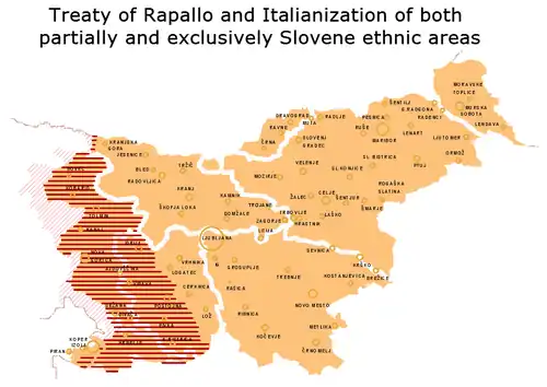 In exchange for joining the Allied Powers in the First World War, the Kingdom of Italy, under the secret Treaty of London (1915) and later Treaty of Rapallo (1920), was granted rule over much of the Slovene territories. These included a quarter of the Slovene ethnic territory, including areas that were exclusively ethnic Slovene. The population of the affected areas was approximately 327,000[20] of the total population of 1.3 million Slovenes.[21]