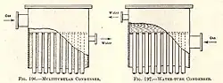 Water-cooled condensers were mainly constructed from riveted mild steel plates (which form the outer shell) and steel or wrought-iron tubes. There were two distinct types used: