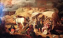 Painting of marauding 17th century soldiers, depicting people and the landscape being devastated by military campaigns