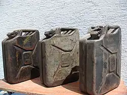 The North African campaign saw the widespread adoption of the 20 litre jerry can, a German invention that was copied by the British and Americans. The jerry can had convenient carrying handles and could be stacked. It did not shift or roll in storage, and floated in water when filled with petrol. The British version was an exact copy of the German model; the American version, called an Ameri-can by the British, was slightly smaller, with a screw cap onto which a nozzle could be fitted. It weighed 4.5 kilograms (10 lb) empty, and 18 kilograms (40 lb) when filled with petrol, so 56 filled cans weighed 1.0 tonne (1 long ton).[150] Some 11.5 million jerry cans were provided for Operation Overlord. Of these, 10.5 million were manufactured in the UK and supplied to the US Army under Reverse Lend-Lease, while the rest came from the US.[151]