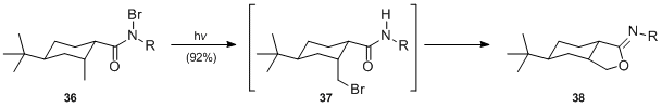 - It has been demonstrated that photolysis of N-haloamides proceeds efficiently under neutral conditions. Irradiation of N-bromoamide 36 (R=tBu) gave rise to bromomethyl-cyclohexane-amide 37 which, upon treatment with base in situ afforded iminolactone 38 in 92% yield.[22]