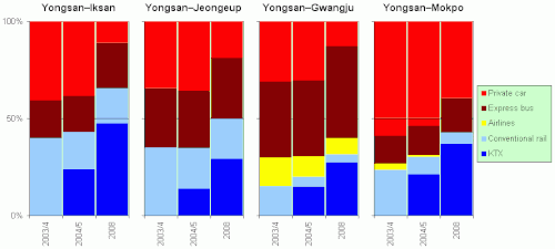 After its first year of operation, on relations with significant distances along the conventional Honam Line, the Honam KTX service gained market share mostly at the expense of conventional trains, while the total share of rail was stagnant on some relations.[5] By 2008, between Yongsan and the cities mid-way along the Honam Line, rail's total modal share passed 50%.[21] Strong gains at the expense of air transport and private cars were seen between Yongsan and Honam KTX service endpoints Mokpo and Gwangju, too.[21]