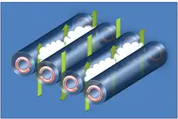 If the environmental air is near saturation, condensation may occur in updrafts produced from the vortex rotation. The sinking motion produced between alternating pairs of rolls will evaporate clouds. This, combined with the updrafts, will produce rows of clouds. Glider pilots often use the updrafts produced by cloud streets enabling them to fly straight for long distances, hence the name “cloud streets”.