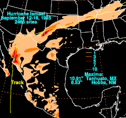 Moisture from the remnants of Ismael extended into southwestern Arizona and southern New Mexico. The storm dropped heavy precipitation near the New Mexico/Texas border, including a peak total of 8.53 inches (217 mm) in Hobbs, New Mexico.[9] In addition, there were unofficial estimates of over 10 inches (250 mm). The rainfall led to flooding of roads and buildings. Multiple highways and railroads were closed due to washouts. Damaged totaled to $250,000 (1995 USD) in New Mexico.[10] In Lubbock, Texas, the rainfall led to flash flooding, closing many intersections and roads.[11] The remnants of Ismael produced over 3 inches (76 mm) of rain in southwestern Oklahoma and northern Arkansas,[9] with moisture extending eastward into the Mid-Atlantic States.[1] There, the rainfall helped to relieve drought conditions.[12]