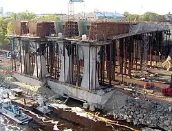Flatiron Construction, Inc. and Manson Construction Co. were awarded the contract on September 19, 2007; Flatiron's was the highest-priced and longest schedule of the bids submitted.[21] The lead designer was Figg Engineering,[22] with Ayres Associates providing hydraulic and scour analyses. TKDA of Saint Paul was the engineer of record for the approach highways, second street bridges, retaining walls, lighting, and water resource engineering services on the project.[23] While the total cost was expected to be between USD $300 million and $350 million for the 1,900-foot (579 m) multi-span bridge, including financial incentives for accelerating the schedule,[11] the winning bid was for USD $234 million. Disincentives for missing the completion date of December 24, 2008 included a $200,000 per day penalty, while incentives to finish early could have been as much as $27 million.[21][24]