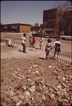 By the 1980s, the Wells homes were plagued by problems such as neglect by the housing authority,[9] gang violence, shootings, drug abuse, and drug dealing.[10] The Black P. Stones gang in particular asserted authority over the area and residents of the Ida B. Wells Homes; Eugene Hairston, co-founder of the gang, was shot dead at his home there in September, 1988.[11] One mother-and-son cocaine ring in the project reputedly had customers standing in line "50 at a time, 'like at a Popsicle stand on a hot day'".[12] The 30-minute audio documentary Ghetto Life 101, released in 1993, was made by two teenagers from the project, LeAlan Jones and Lloyd Newman. Their second audio documentary, Remorse: The 14 Stories of Eric Morse, which won a Peabody Award,[13] deals with the murder of 5-year-old Eric Morse in the project on October 13, 1994; he was pushed from the window of a vacant 14th-floor apartment by two older boys (aged 10 and 11) after he refused to steal candy for them.[1][14][15][16] The project was also the location for Frederick Wiseman's 1997 documentary Public Housing.[17][18][19]