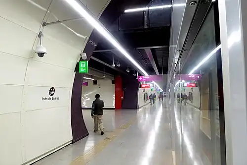 Inés de Suárez is an underground metro station on the Line 6 of the Santiago Metro, in Santiago, Chile. This station is named for Inés de Suárez, a woman from Extremadura who was a companion and a one-time lover of the conqueror Pedro de Valdivia, who took an important part of the control in the defense of the city of Santiago against the indigenous resistance. A short distance from the station is the Inés de Suarez Park and the Plaza Pedro de Valdivia. The station was opened on 2 November 2017 as part of the inaugural section of the line, between Cerrillos and Los Leones.[1]