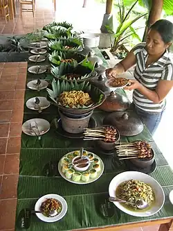 Rice has been an essential staple for Indonesian society, as bas-reliefs of 9th century Borobudur and Prambanan describes rice farming in ancient Java. Ancient dishes were mentioned in many Javanese inscriptions and historians have succeeded in deciphering some of them. Inscriptions from the 8th to 10th century Kingdom of Mataram era mention several ancient dishes, among others are hadaŋan haraŋ (minced water buffalo meat satay, similar with today Balinese sate lilit), hadaŋan madura (water buffalo meat simmered with sweet palm sugar), and dundu puyengan (eel seasoned with lemon basil).[17] Also various haraŋ-haraŋ (grilled meats) either celeṅ/wök (pork), hadahan/kbo (water buffalo), kidaŋ/knas (deer) or wḍus (goat).[18] Ancient beverages include nalaka rasa (sugarcane juice), jati wangi (jasmine beverage), and kinca (tamarind juice). Also various kuluban (boiled vegetables served in spices, similar with today urap) and phalamula (boiled yams and tubers served with liquid palm sugar).[19] Other ancient vegetable dishes include rumwah-rumwah (lalap), dudutan (raw vegetables) and tetis.[20]