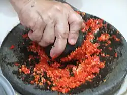 Indonesian cuisine often has complex flavours,[8] acquired from certain ingredients and bumbu spice mixtures. Indonesian dishes have rich flavours; usually described as savory, hot and spicy, and also combination of basic tastes such as sweet, salty, sour and bitter. Most Indonesians favour hot and spicy food, thus sambal, Indonesian spicy chili sauce with various optional ingredients, notably shrimp paste, shallots, and others, is a staple condiment at all Indonesian tables.[9] The seven main Indonesian cooking methods are frying, grilling, roasting, dry roasting, sautéing, boiling and steaming.