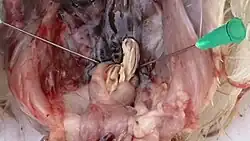 | Enlarged bursa of Fabricius with yellowish peribursal oedema | |