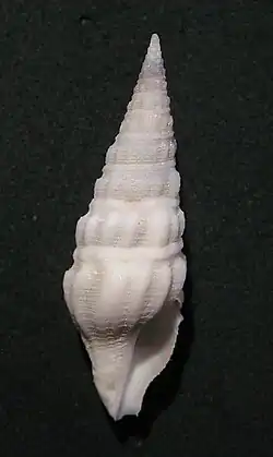 The turreted shell is snowy white, sometimes faintly rose-tinged. It is longitudinally ribbed, with very fine revolving grooves and striae. It is somewhat depressed next the suture. The sinus is broad.[2]