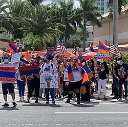 Ethnic Armenian populations around the world have lobbied for peace negotiations.[125] On 1 October, the South Ossetian Armenian community condemned Azerbaijan and Turkey, urging recognition of Artsakh's independence.[126] The next day, Armenians in Samtskhe–Javakheti, in Georgia, expressed concern and their intention to send aid.[127] Subsequently, Georgia closed its border with Armenia, indicating frustration within Georgia's Armenian minority.[128] Croatia's Armenian diaspora's leader asked for support against what she described as a genocide against the Armenians.[129] On 5 October, Armenian Americans protested outside the Los Angeles (LA) CNN building, calling for more accurate coverage.[130] On 11 October, the LA community held a 100,000-person strong protest march to the Turkish Consulate, in tandem with smaller protests in Washington, San Francisco, New York City, Boston and elsewhere in the United States.[131][132] LA's mayor expressed support for Armenia and the city's Armenian community by lighting up City Hall with the Armenian flag's colours.[133][134] A protest was held in Orange Country during President Trump's pre-election rally calling on him to sanction Turkey and Azerbaijan; Trump praised them by saying, "the people from Armenia have great spirit for their country".[135][136] Protests have occurred all over Europe demanding recognition of Artsakh's independence, with the largest rallies held in Paris, France, and in front the Council of the European Union in Brussels, Belgium.[137] A major rally was held in Aleppo, Syria by Armenians and Syrians condemning Azerbaijan and Turkey.[138] Armenian communities have also protested globally, notably in Argentina,[139] Australia,[140] Canada,[141] and Uruguay.[142]