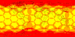 The constellation consists of 66 active satellites in orbit, required for global coverage, and additional spare satellites to serve in case of failure.[3] Satellites are placed in low Earth orbit at a height of approximately 781 kilometres (485 mi) and inclination of 86.4°. The nearly polar orbit and communication between satellites via Ka band inter-satellite links provide global service availability (including both poles, oceans and airways), regardless of the position of ground stations and gateways.
