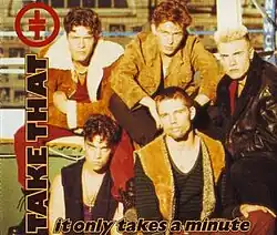 English boyband Take That recorded a cover of "It Only Takes a Minute" and released it as a single on May 25, 1992, as the fourth single from the band's debut album, Take That & Party (1992). It became the band's first top-10 single, charting at number seven on the UK Singles Chart. The song was performed in conjunction with "Do What U Like" in the Take That Hometown Tour which featured Mini Take That. Robbie Williams has a solo section in the last chorus, although he is uncredited.