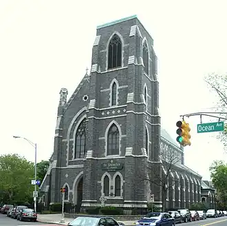 The name Claremont appears in mid-19th century maps of Greenville Township, neighboring Bergen City, and Jersey City, which were consolidated by 1872.[21][22] The area was laid out on Bergen Hill west of Bergen Point Plank Road, now Garfield Avenue. Today's Claremont Avenue created the border of what has become known as the Greenville and Bergen-Lafayette sections of the city. The Central Railroad of New Jersey maintained a station by the name south of the junction of its main and Newark branch line[23][24] until service was discontinued in 1967.[25][26] Claremont Bank, which later become part of the Trust Company of New Jersey, began in the area.[27] The Claremont Branch of the Jersey City Free Public Library opened in 1954, and was replaced the Cunningham Branch in 2004.[28] Claremont Terminal east of the neighbourhood is a maritime facility created from tidal flats in the Upper New York Bay opened in 1923.