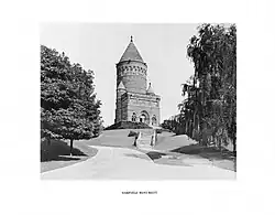 The Garfield Memorial Committee selected the highest point in the cemetery in June 1883 for the president's final resting place.[9] Lake View Cemetery built a road around the memorial in early 1885 and began work on cutting a road from the Euclid Gate to the memorial site later that fall. The cemetery also began work on making improvements to the landscape, water, and drainage around the site.[10]