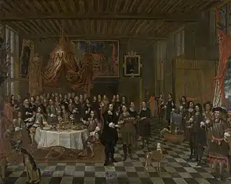 Van Meunincxhove painted two remarkable paintings documenting events which occurred during the residence in Bruges of Charles II of England and his brothers Henry Stuart, Duke of Gloucester and James Stuart, Duke of York in the period from 22 April 1656 to 15 March 1659. On 2 October 1656 the King and his brothers visited the Bruges Guild of the 'Kolveniers' (Guild of Harquebusiers) where the Duke of York successfully shot the target (a parrot). This was cause for great celebration among the local population and was immediately recorded in a poem by Ingelbrecht Cockuyt of the Bruges Chamber of Rhetoric. Van Meunincxhove remembered the same event about 15 years later in two works that were destined for the new premises of the Guild of the Kolveniers (both now in the Groeningemuseum). One of the compositions depicts the celebration meal and the other the King and his retinue in the 'Hoveningen', the walled garden of the Guild. In the second picture depicting the Hoveningen, van Meunincxhove follows the style of genre paintings developed in Flanders after 1660 by artists such as Gillis van Tilborch: he depicts the two groups of three persons on the left foreground on a small scale while the persons surrounding the King have an abnormally long leg which serves to pull the viewer into the depth of the composition. The fabric of the clothing is rendered in rich detail while the artist also depicts some anecdotic details such as the children who climb the wall to better view the event. The second painting depicting the celebration meal includes a representation of the painting of the Hoveningen.[6]