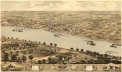Jefferson City is located on the northern edge of the Ozark Plateau on the southern side of the Missouri River in a region known as Mid-Missouri, that is roughly mid-way between the state's two large urban areas of Kansas City to the west and St. Louis in the east (along the west bank of the Mississippi River). It is 29 miles (47 km) south of Columbia, Missouri, and sits at the western edge of the Missouri Rhineland, one of the major wine-producing regions of the Midwest. The city is dominated by the monumental domed Missouri State Capitol, which rises from a bluff overlooking the nearby Missouri River to the north. Lewis and Clark with their Corps of Discovery passed the bluff here on their historic expedition upriver in 1804, eventually journeying westward to the Pacific Northwest region and the Pacific Ocean, before Europeans or Americans established any settlement there.