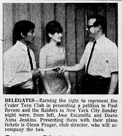 April 26, 1967 - Daave Anna Jenkins and Jose Escamilla (age 16) were named winners in the Crater Teen Club petition contest. They worked to get the most signatures to win a trip to New Your City to represent Roswell at The Ed Sullivan Show. The reason for the trip was to present to the group Paul Revere and the Raiders the petition to reschedule the canceled performance the "Raiders" was supposed to perform for the Roswell Teen Club.[2]