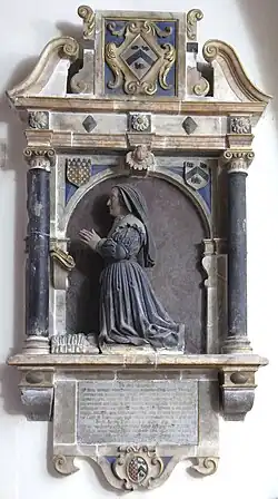 Mural monument to Ursula Strode (d. 1635), 1st wife of Sir John III Chichester (d. 1669) of Hall. South wall of chancel, Bishop's Tawton Church