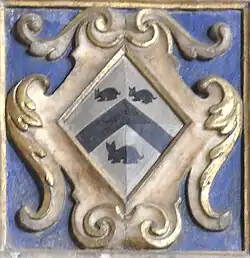 Arms of Strode: Argent, a chevron between three conies courant sable, detail from mural monument to Ursula Strode (d. 1635), 1st wife of Sir John III Chichester (d. 1669) of Hall. Bishop's Tawton Church