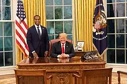 James supported Ted Cruz in the 2016 Republican Party presidential primaries.[48] He later became a Trump supporter,[48] and tweeted in 2018 that, if elected to the Senate, he would back Trump "2,000%."[52][53] During his 2020 campaign, James accepted Trump's endorsement and campaigned alongside him.[54][55] James has not been publicly critical of Trump or his actions.[50] During a meeting with black faith leaders, James was asked whether he disagreed with Trump on anything. James said, "Everything from cutting Great Lakes funding to 'shithole countries' to speaking ill of the dead. I mean, where do you want to start?"[56] In a leaked audio recording of a meeting with African American leaders in Michigan, James was asked why he hadn't publicly criticized Trump. He said he thought it was better to be silent in public in order to gain access to Trump. James said, "Donald Trump doesn't need less Black folks around him, he needs more," and that his goal was "achieving equity and equality for our people, not standing up on Twitter and condemning folks."[57] During the campaign, Democrats sought to tie James to Trump, while James has said his candidacy was not a referendum on Trump.[46]