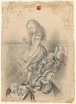 Tenniel's "grotesque" was one reason why Lewis Carroll wanted Tenniel as his illustrator for the Alice books, in the sense of imparting a disturbing sense that the real world may have ceased to be reliable.[30] Tenniel's style was characteristically grotesque through his dark, atmospheric compositions of exaggerated fantasy creatures carefully drawn in outline.[31] Often the mechanism was to use animal heads on recognisable human bodies or vice versa, as Grandville had done in the Parisian satirical journal Charivari.[32] In Tenniel's illustrations, the grotesque is found also in mergers of beings and things, deformities in and violence to the human body (e. g. when Alice drinks the potion and grows huge), and a proclivity to deal with ordinary things of this world while presenting such phenomena.[30] The most noticeably grotesque is Tenniel's famous Jabberwock drawing in Alice.