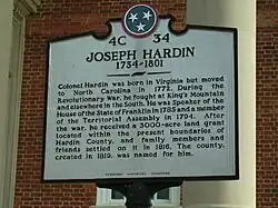 Joseph Hardin Sr. (April 18, 1734 – July 4, 1801) was an Assemblyman (in the Provincial Congress) for the Province of North Carolina, and was a signatory of the Tryon Resolves. Early in the War for Independence, as a member of the militia from Tryon County, Hardin fought the Cherokee allies of Britain along the western frontier. Later in the war, having taken his family over the Appalachian Mountains to the Washington District[1] for safety against the advance of the Red Coats out of South Carolina, Hardin joined the Overmountain Men. He saw action at the Battle of Ramsour's Mill and the decisive Battle of Kings Mountain. Following the peace with Britain, Hardin was a co-founder and second Speaker of the House for the State of Franklin; and an Assemblyman in the Southwest Territory before its statehood as Tennessee.
