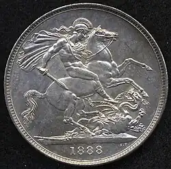 For the various reverses, according to Dyer and Gaspar, "Fremantle had revived some of the finest heraldic designs from the past".[16] He felt that a reverse design with the denomination inside a wreath was "feeble", and sought artistic designs.[16] Fremantle selected designs originating with the Great Recoinage of 1816–1817 or even further back, and these were engraved by Wyon.[17] In 1873, soon after he had assumed the deputy mastership, Fremantle had secured the return of Benedetto Pistrucci's 1817 design of Saint George and the Dragon to the sovereign,[16] for the first time in almost half a century.[18] This design appeared on the gold sovereign, double sovereign and five-pound piece of the Jubilee coinage, and also on the silver crown, or five-shilling piece.[19] Beginning with the Jubilee coinage, a plume was restored to Pistrucci's design; it had featured in his original work, but had later been omitted.[20] The sixpence, shilling, florin, half crown, half sovereign and a new coin, the double florin, were given variations of the ensigns armorial of the United Kingdom. This was done in several guises: thus, according to the proclamation making them current that was issued in May 1887, the half sovereign had a "garnished Shield surmounted by the Royal Crown" while on the half crown, they were "in a plain Shield surrounded by the Garter, bearing the Motto 'Honi soit qui mal y pense' and the Collar of the Garter".[19] The half sovereign's reverse design was a slight modification to those of earlier Victorian half sovereigns, and its crowned shield did not differ much from designs used since the denomination had originated in 1817.[21] Each of the reverses for the sixpence and above carried the date of minting, but none carried a statement of the coin's monetary value.[22] The sixpence had borne a wreath surrounding a statement of its value since 1831,[23] with one reason for this being that it was the same size as the half sovereign, and was sometimes fraudulently plated to pass as one.[7]