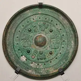The tumulus was excavated in 1925, at which time a vertical-type stone-lined burial chamber was discovered in the center of the posterior circle. The chamber had an inner length of 6.5 meters, a width of 0.9 meters, and a height of 1.2 meters. The opening of this burial chamber in 1928 drew considerable attention due to the wealth of grave goods and clear connections to the Kansai region of Japan. It had a thick vermillion coating on the walls and floor. Of especial interest were five bronze mirrors, which had been made from the same mold as bronze mirrors recovered from the Bizen Kurumazuka Kofun (Okayama), the Sanbongi Kofun (Fujioka, Gunma), and the Fujisaki Site (Fukuoka, leading to speculation that these were some of the 100 mirrors sent by Emperor Cao Rui to the Kingdom of Yamatai in 238 AD per ancient Chinese records. [2]