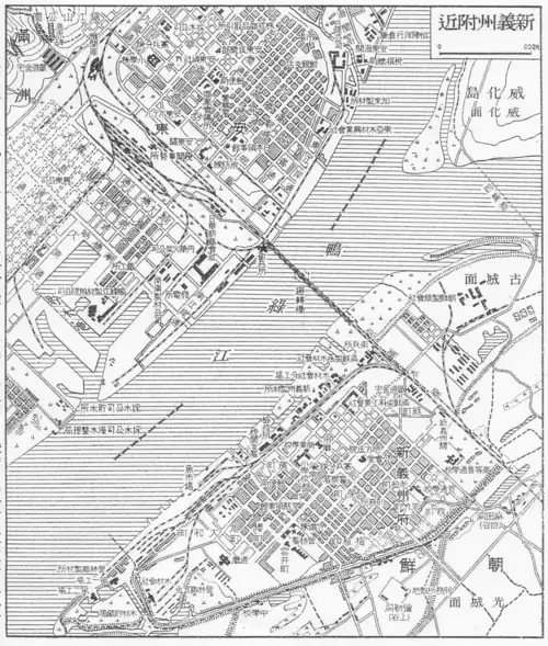 As a result, Sentetsu opened a new station in Sinŭiju (on the site of today's Sinŭiju Ch'ŏngnyŏn Station), with the original station, located 1.8 km (1.1 mi) northwest of the new station, being renamed Lower Sinŭiju Station.[2]
