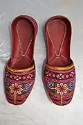 Sindhi Khusso, Multani Khussa or simply just Khussa (Urdu: کُھسّہ), is a traditional footwear[1] produced in Sindh and Multan in Pakistan.[2][3][4] Khussa are hand-made by local artisans mostly using vegetable-tanned leather. The uppers of Khussa are made of one piece of leather or textile, which is embroidered and embellished with brass nails, cowry shells, taunra, mirrors, bells and ceramic beads. Even the bonding from the upper to the sole is done by cotton thread that is not only eco-friendly but also enmeshes the leather fibers with great strength. Some product range also uses bright and ornate threads.[5]