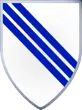 ![]() shield, charge bendy Gules and Argent, helmet, torse and red and white mantling; in crest demi Lion rampant Gules charged with four lilies holding in the paws a Banner of arms Gules flowing to the dexter charged with two cross | |