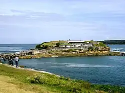 The La Perouse Museum contains maps, scientific instruments and relics recovered from French explorers. A walking trail from the museum to the Endeavour Lighthouse has views across the bay to the site of Captain Cook's Landing Place. The large Lapérouse Monument is an obelisk erected in 1825 by the French, located close to the museum.[31] Another memorial marks the grave of Father Receveur.[32] The fortified Bare Island is linked by a footbridge. The museum was originally built as cable station to house the operation of the first submarine telegraph communications cable laid between Australia and Nelson in New Zealand. This cable also served as the first link in telegraph communications between New Zealand and the rest of the world. After the cessation of telegraph communications, the building served as a home for orphans run by the Salvation Army, with the children attending La Perouse Public School when this first opened in the early 1950s.[33][34]