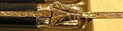 The Calmels laguiole droit had a 'half-lock' on the blade where a small projection on the end of the backspring (mouche) exerts pressure on a corresponding indent in the heel of blade when the knife is open; this, and not the full locking system of the navaja, remained a fixed feature in subsequent laguiole knives. Seasonal migrations of shepherds and cattle herders between Catalan Spain and southern France in summer and winter introduced the navaja to France.[5]