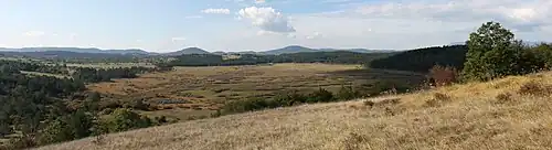 Lake Palčje (Slovene: Palško jezero) is an intermittent lake in the Pivka basin north of the settlement Palčje in the Inner Carniola region of Slovenia.[3] It fills an oval-shaped karst depression, crossed by Pivka, and approximately 1.5 km (0.93 mi) long and 0.5 km (0.31 mi) wide. Its bottom is relatively level at between 543 and 557 m (1,781 and 1,827 ft) above sea level, but the banks are steep. Lake Palčje is the largest among the Pivka Lakes with average maximum water area around 1 km2 (0.39 sq mi).[1][2][4]