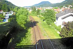 First, the Landau–Annweiler section was built, partly over sections of the Albersweiler Canal, which had been built in the late 17th century, and operations started on 12 September 1874. As early as 25 November 1875, the line was extended to Zweibrücken and connected to the link to the Palatine Ludwig Railway.[6][7] Conceptually, it was a direct continuation of the Germersheim–Landau railway and the official chainage (distance markings) run in sequence over both routes. At the same time, a branch line was opened from Biebermühle station, which is located at the confluence of the Rodalb with the Schwarzenbach, to Pirmasens. In addition, the original Zweibrücken station was not in an appropriate location for a through station and it had to be so moved to its present location. Although the line was initially built as a single track, its track base, engineering structures and crossings were designed to be duplicated.