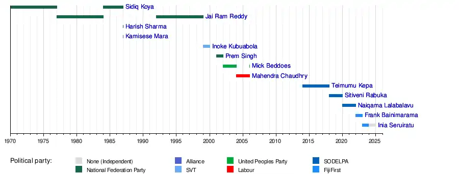 | 1 | Sidiq Koya (1924–1993)  | 1970 | 1977 | 6–7 years | NFP | 1972 1977 (Mar)  | Mara | ||